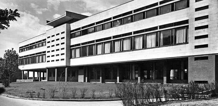 На первом этаже расположены: администрация, столовая, гостиница, театр на 500 мест, спортзал, медчасть, костюмерная На втором этаже – 20 танцевальных залов и двухэтажные раздевалки На третьем этаже – общеобразовательная школа, музыкальные классы, общежитие Проект изначально был индивидуальным, более того, здание такого типа строилось впервые в мире Перед нами стояли непростые задачи Во–первых, главным условием было возведение здания с использованием уже существовавшего фундамента от несостоявшегося музея Дарвина Во–вторых, кроме обычных норм для образовательного учреждения, в этом здании к конструкциям полов и сцены предъявлялись особые требования – уклон должен в точности соответствовать уклону сцены Большого театра Третьей проблемой стал кубинский кризис, приостановивший строительство Здание приподнято над уровнем проездов на 2 метра, что обусловлено высоким уровнем грунтовых вод Кругом высотные жилые дома, отсюда желание как–то отгородить внешнее окружение, создать свой мир Так