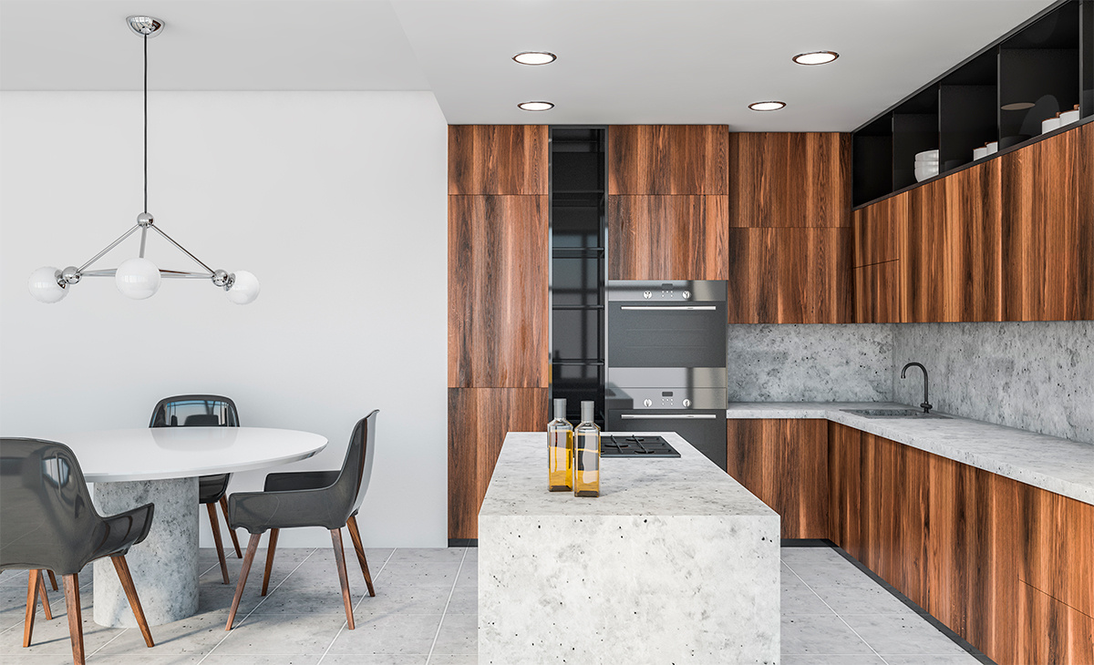 Кухонный остров остается главным героем, выполняя роль барной стойки, рабочего стола, места для сервировки и даже мини-офиса. Он помогает визуально разделить пространство открытой планировки.