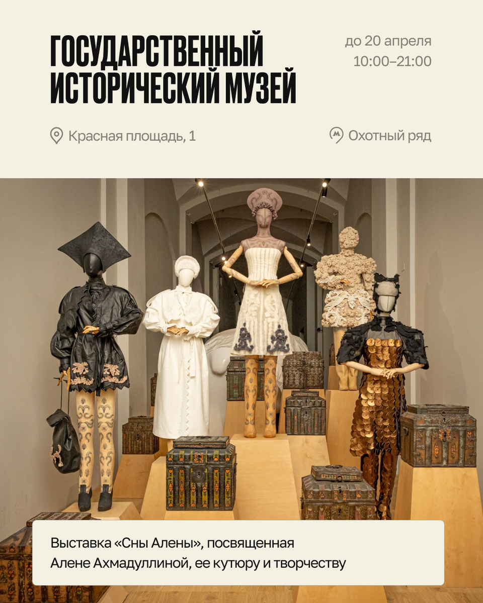 Если хочется наполнить выходные смыслом, красотой и вкусной едой, этот маршрут можно брать без раздумий. В программе — мода и современное искусство, блошиный рынок с сокровищами, фестиваль салатов, кино Линча и несколько гастрономических поводов выйти из дома. Собрала планы так, чтобы получилось и погулять, и вдохновиться, и хорошо поесть. Выставка «Сны Алены», посвященная Алене Ахмадуллиной и ее миру кутюра. Это не просто про моду, а про визуальный язык, образы и фантазии дизайнера. Отличный повод снова зайти в ГИМ и посмотреть на него с неожиданной стороны.
