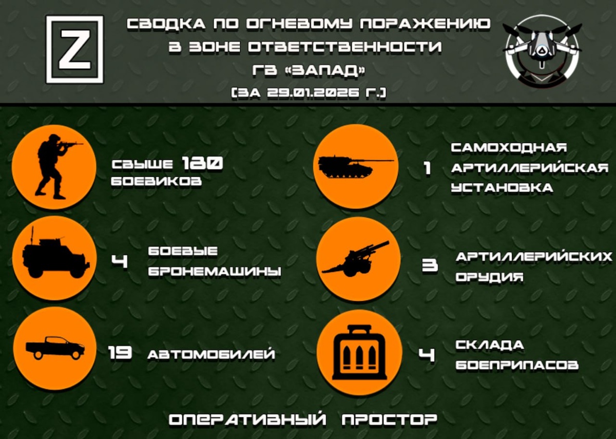 Сводка по огневому поражению в зоне ответственности ГВ «Запад» за 29.01.2026 г
