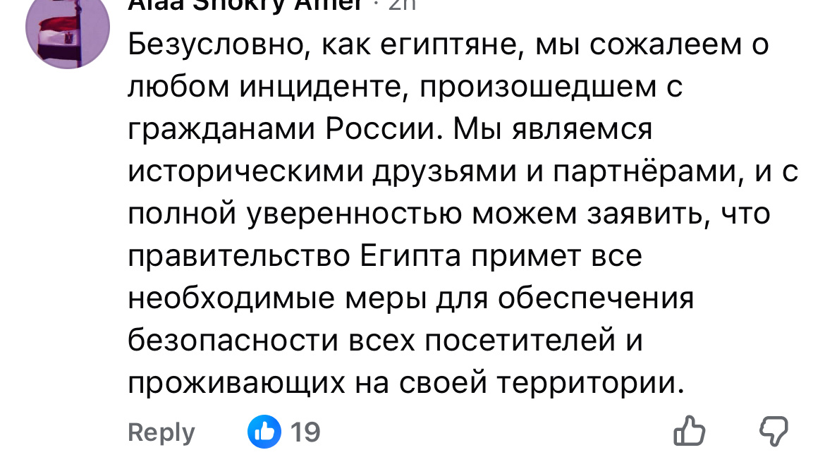 Нужно сказать, что египтяне любят россиян, между нашими народами существует давняя историческая дружба, египетский президент Абдель Фатах Ас-Сисси частый и желанный гость в РФ. В то же время англичан они недолюбливают, памятуя им не столь давнее колониальное прошлое. Вот как простые египтяне отреагировали на данный инцидент: