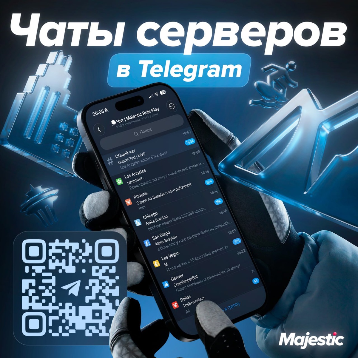 : 📱👨💻 ✌️ Конечно, если вы зайдете в Telegram-чат с игроками своего сервера — мы собрали для вас их все в одном месте! 👕👕💬 ЗАЙТИ В ЧАТ 💬 Уверены, что он станет незаменимым местом для общения, особенно если Discord работает нестабильно. ❤️ Majestic Role Play