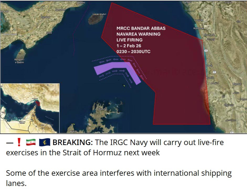В КСИР заявили, что с 1-2 февраля проведут учения ВМФ с боевой стрельбой в Ормузском проливе. Некоторые районы учений включают основные международные морские пути. Иран призвал нефтяные танкеры и другие коммерческие суда двигаться южнее от зоны учений. Цена на нефть за сутки поднялась на $4.