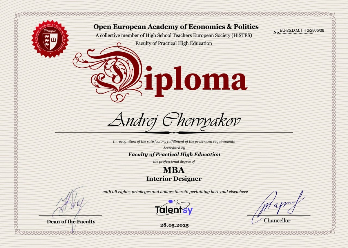 Хочу поделиться долгожданным для меня событием.Диплом международного образца.Только вчера прислали....бумажного варианта не знаю сколько еще ждать. Это еще одна ступень,один этап,один,простите,чемодан знаний....это опыт. Искренне Ваш,А.Червяков,дизайнер интерьера.