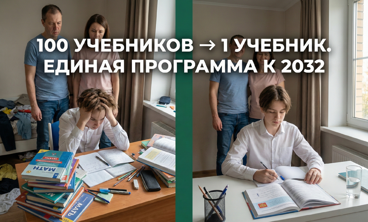 ОТ 100 ЛИНЕЕК МАТЕМАТИКИ ДО ОДНОГО УЧЕБНИКА Еще 10 лет назад в российских школах использовалось 65 разных учебников истории без единой трактовки событий. По математике существовало 100 линеек учебников. С 2012 года Минпросвещения постепенно исправляет ситуацию, создавая единые государственные учебники по всем предметам. Первыми стали учебники истории для 10-11 классов (с 2023 года), затем для 5-7 классов (с 2024 года). Для 8-9 классов единые учебники по истории появятся в 2026 году. ГРАФИК ВНЕДРЕНИЯ ДО 2032 ГОДА 2026 год — русский язык (1-11 классы), литература, география (5-11), ОБЗР (8-11), духовно-нравственная культура России (5-7), физико-математические предметы для старшеклассников. 2030 год — ИЗО (1-7 классы), музыка (1-8 классы). 2031 год — иностранный язык (2-11 классы). 2032 год — физическая культура (1-11 классы). Подготовка всех учебников завершится к 2029 году, массовое внедрение начнётся с 2028 года. ПРЕИМУЩЕСТВА ЕДИНЫХ УЧЕБНИКОВ Государственные учебники стоят в несколько