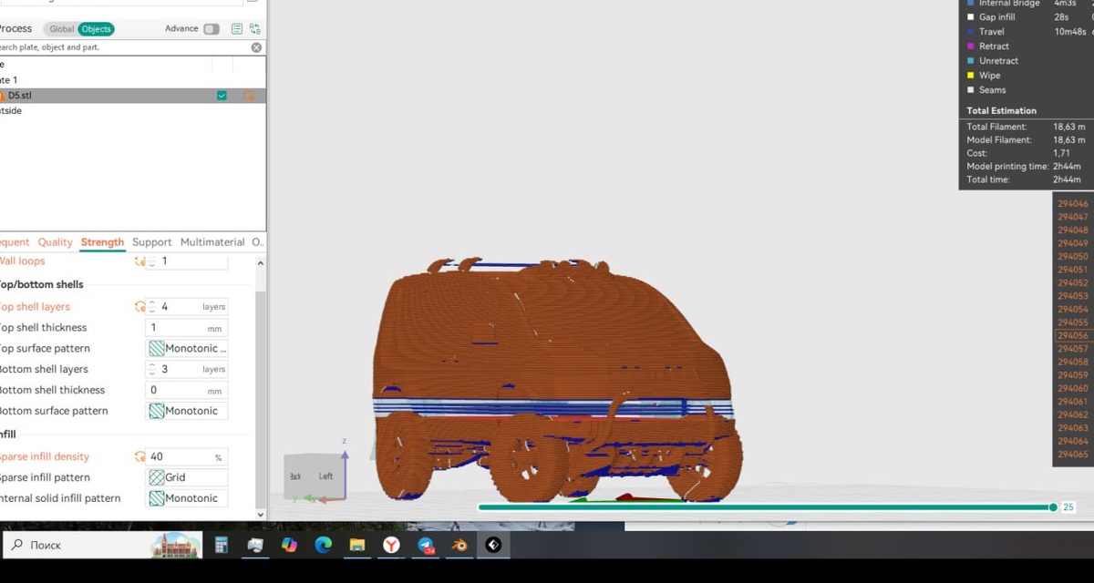 Я тут пытаюсь сформулировать некоторые мысли по поводу 3 д печати и моделинга в нейросетях с практически полного нуля и это даже работает. Особенно если допилить и несильно притязательно смотреть. Но это еще фигня, в какой-то момент без предупреждения и подготовки слайсер решил что модель должна быть с вентиляцией..... Признаюсь заметил не сразу, ибо у вас на картинке один из наиболее заметных артефактов, а первые разы он просто в середине модели решал что надо бы перепрыгнуть через 1-2 слоя ну и моделька ожидаемо после этого расклеивалась. В чем проблема, пока не понял.В исходной модели проблем не обнаружилось, а вот слайсер... Спустя пару десятков положений нашлось то где модель нарезается без пропуска, печатаем.