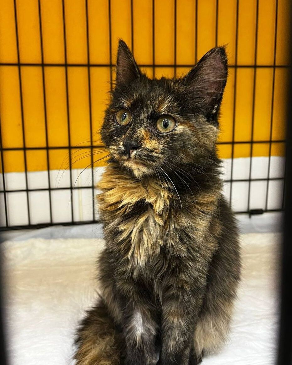 Нюся — пушистая малышка черепахового окраса. Была спасена с улицы, сейчас живет в клеточке и ищет дом.