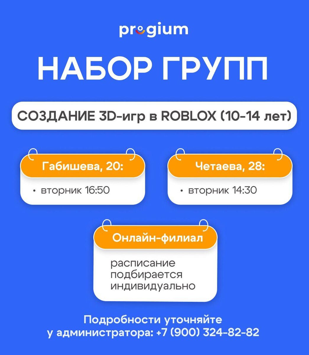 ROBLOX STUDIO🔽 📎Благодаря этому направлению наши ученики становятся настоящими разработчиками, ведь мы учим понимать, как устроена игровая разработка изнутри 💡 📎Ребята оживляют объекты и управляют своим миром с помощью кода Lua 🧩 🖇️Контакты 🅰Четаева, 28: 8(900)324-82-82 🅰Габишева, 20: 8(927)039-10-18 🅰Онлайн: 8(950)324-51-55 Наш сайт