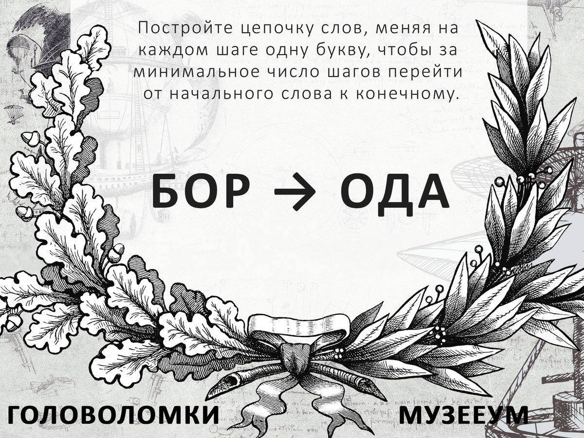 🧩Регулярные упражнения для мозга — залог ясности мысли и быстрой реакции. Эта задача — как пробежка для ума: она разогревает нейронные связи, улучшает концентрацию и учит находить нестандартные решения. Решите её — и вы почувствуете, как мозг становится гибче. 🧔♂🧠 ❓Решите головоломку: Постройте цепочку слов, меняя на каждом шаге одну букву, чтобы за минимальное число шагов перейти от начального слова (бор) к конечному (ода). 🔗 Больше интересных мужских головоломок в библиотеке МузееУм: