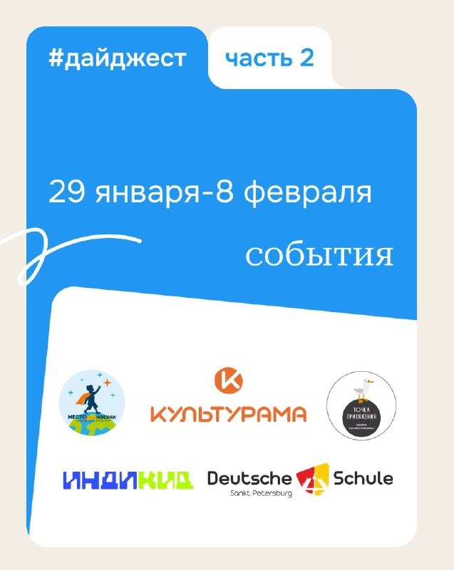 : • 2 февраля День открытых дверей в школе ИндиКид Крестовский остров https://vk.cc/cEWVUW • 5 февраля Бесплатные танцы для детей с ОВЗ (СДВГ, РАС, ЗПР, ЗРР) в школе Место для жизни Выборгский район https://vk.cc/cTPdHv • 5 февраля День открытых дверей в частной начальной школе «Точка Притяжения» Крестовский остров https://vk.cc/cTRAQV • 7-8 февраля Открытые уроки в LGEG в Культураме Адмиралтейский район https://vk.cc/cTPdOG • 7 февраля День открытых дверей в Немецкой школе Петроградский район https://vk.cc/cTPdUX Ещё больше событий нашем сайте в Календаре событий