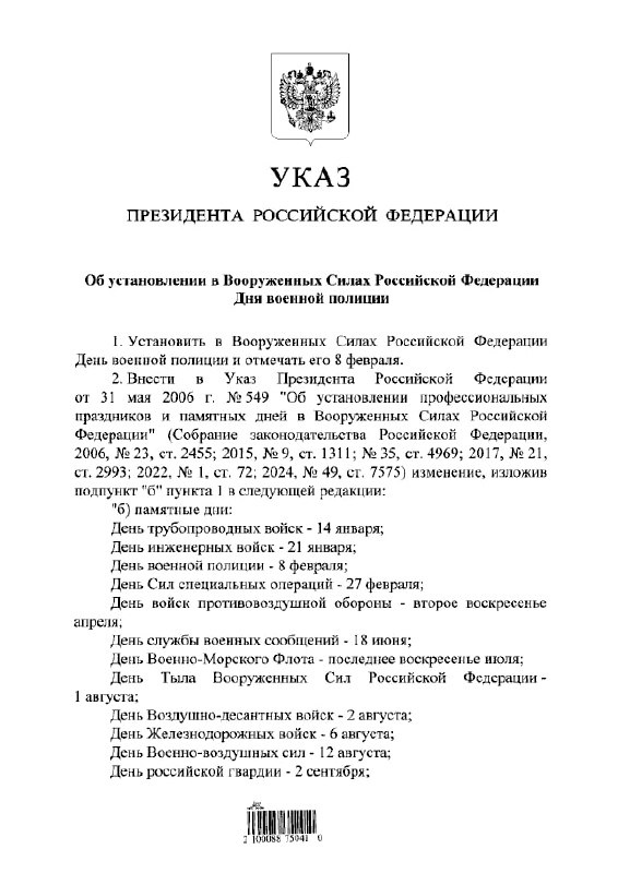 Президент России Владимир Путин 28 января подписал Указ № 35 «Об установлении в Вооруженных Силах РФ Дня военной полиции». Новый праздник буду отмечать 8 февраля — в память об учреждении в 1812 году императором Александром I «Общих правил полевой воинской полиции», заложивших основу армейской дисциплины. Военная полиция создана в 2011 году и подчиняется Минобороны. Он обеспечивает дисциплину в гарнизонах, охрану прав военнослужащих и объектов, ПДД, расследования, правопорядок. В СВО выполняет комендантский час, охрану колонн и защиту личного состава. Севкор теперь в MAX 👉 😍😍Читайте Севкор