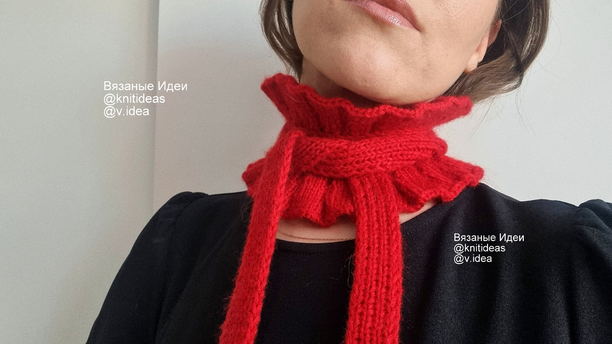 Давайте свяжем красивый мини-шарфик с нежными рюшами. Это несложно и займет совсем немного времени. Вяжется очень просто: сначала вяжем полоску резинкой необходимой длины, затем по центру вяжем рюши с двух сторон. У серого шарфика длина полоски 220 см, а у красного 160 см. Ширина центральной части с рюшами - 11 см. Для вязания потребуется: Описание вязания: Набрать на спицы №3,5 9 петель и вязать резинкой 1 на 1 полоску на необходимую длину (у меня длина 220 см). Далее складываем эту полоску пополам и отмечаем центр маркером. Справа и слева от маркера отсчитываем по 25 кромочных петель (19 см) и ставим маркеры. Расстояние между крайними маркерами - это обхват шеи. У меня обхват 38 см. 38/2 = 19 см (или 25 кромочных петель). Из каждой кромочной петли будем набирать 2 петли (за заднюю и за переднюю стенку петли). Так как после ВТО пряжа растягивается, то можно вычесть 2 см, то есть отложить по 18 см. Получается (25 п. +25 п. ) х 2 п. = 100 петель Ниже схема вязания рюш: Раппор