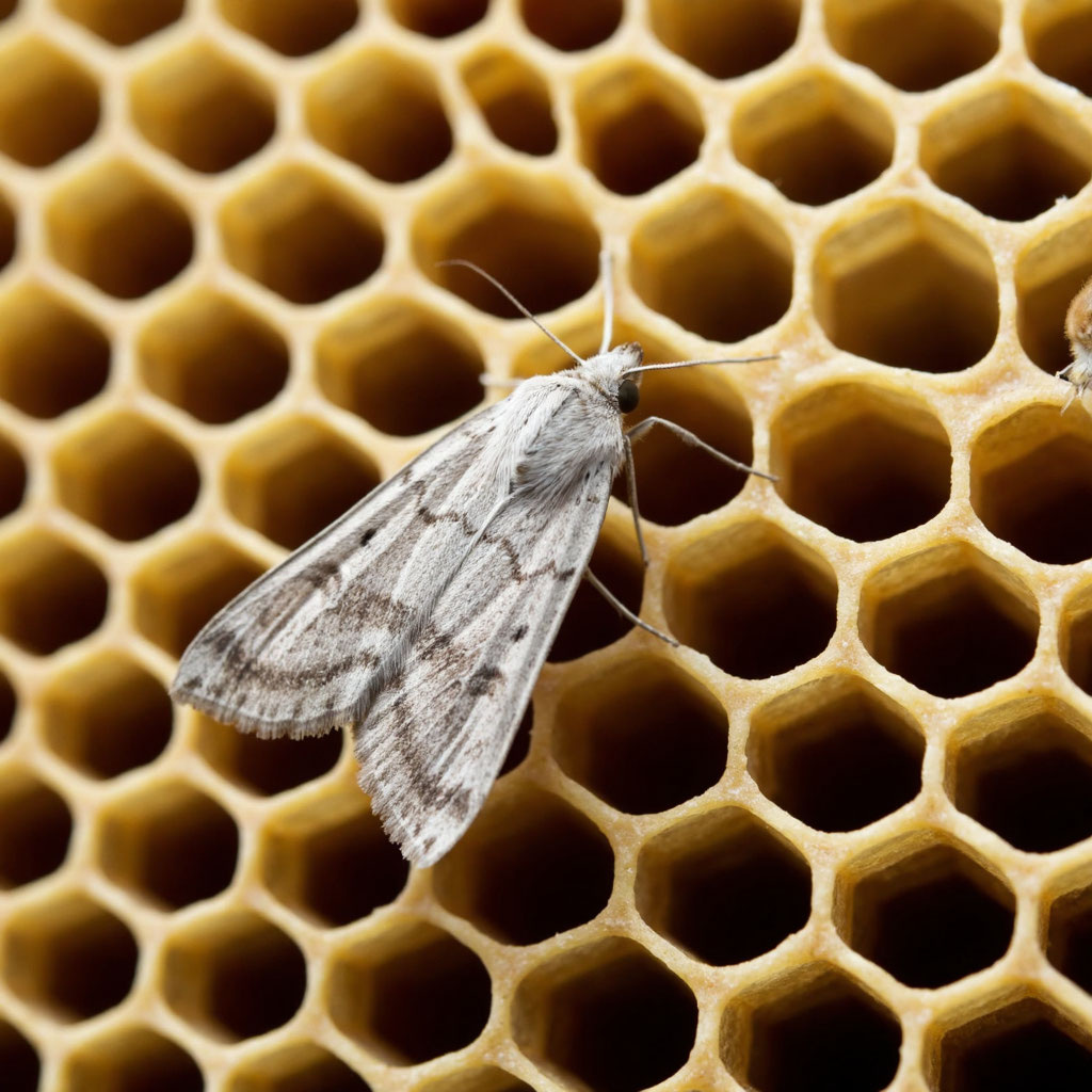 Как распознать появление восковой моли? На сотах при осмотре наблюдаются паутинные ходы и бурые гранулы (экскременты), в улье или сотохранилище летают бабочки размером 2–3 см, а соты выглядят «изъеденными», рамки хрупкие.