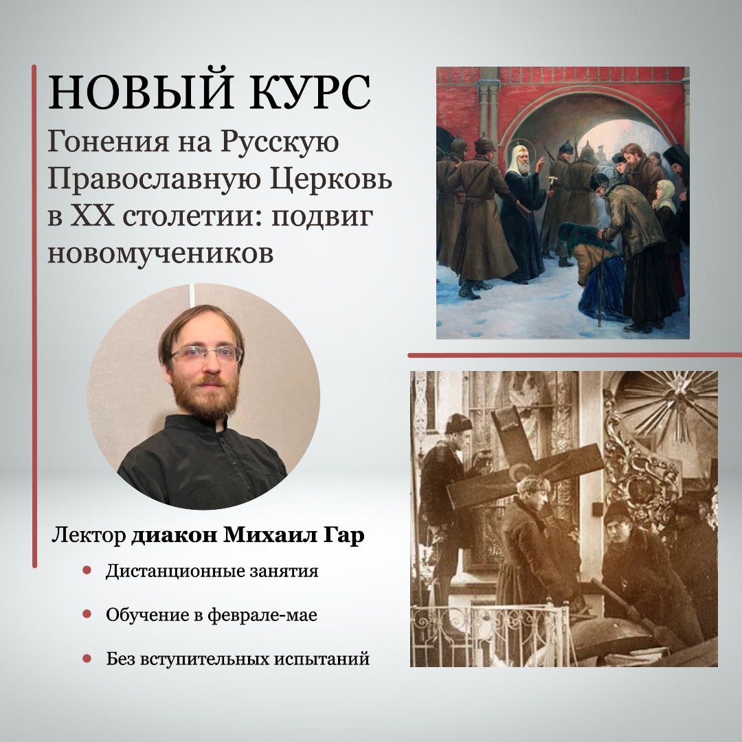 🕯 📚 Факультет дополнительного образования приглашает на авторский онлайн-курс диакона Михаила Гара – старшего специалиста Отдела новейшей истории Русской Церкви и научного редактора проекта «Слово новомучеников». После успешного дебюта курс проводится во второй раз! Отец Михаил многим известен по своим глубоким и живым экскурсиям по Лихову. Его курс на ФДО – это не просто лекции, а возможность вместе со слушателями осмыслить трагическую историю Русской Церкви ХХ века через судьбы новомучеников и исповедников. Заявки на программу принимаются до 4 февраля. Встречи будут проходить онлайн по средам, а записи лекций будут доступны всем участникам. 🔗 Узнать подробности и записаться на курс: clck.ru/3RWE7r Подписаться на ПСТГУ 👨🏫 Задать вопрос #Обучение_ПСТГУ