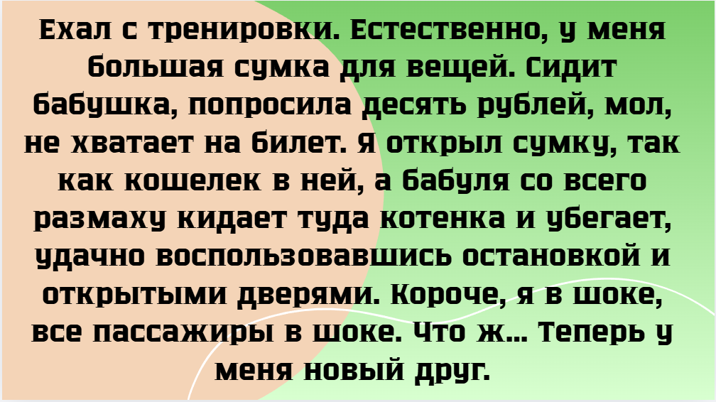 - Еще подростком я нашел первую подработку. С работы меня забирала на машине мама, но в этот раз она задерживалась. Я позвонил ей и сказал, что дойду домой пешком. По дороге встретил одну девчонку которая мне нравилась, мы разговорились и зашли в магазин. А там она говорит: «Ой, там, кажется, мой бывший парень, подыграй мне, будто мы вместе» — и хватает меня за руку. И только в день нашей свадьбы я узнал, что никакого бывшего там не было — ей просто захотелось взять меня за руку. В этом году отмечаем 20 лет вместе. А все из-за того, что я тогда домой пешком пошел. © Владимирский