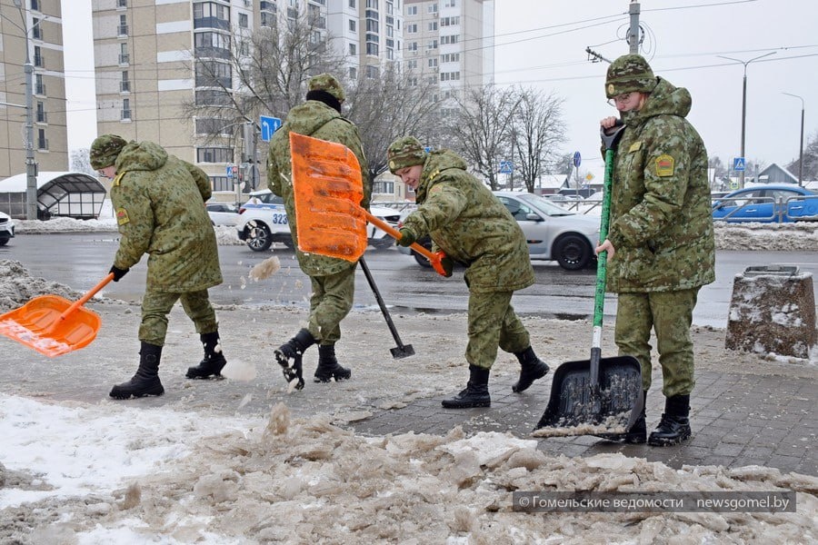 На остановке «Третья школа» в уборке участвуют учащиеся средней школы № 3 имени Д.Н. Пенязькова и работники филиала «Инженерный центр» РУП «Гомельэнерго».