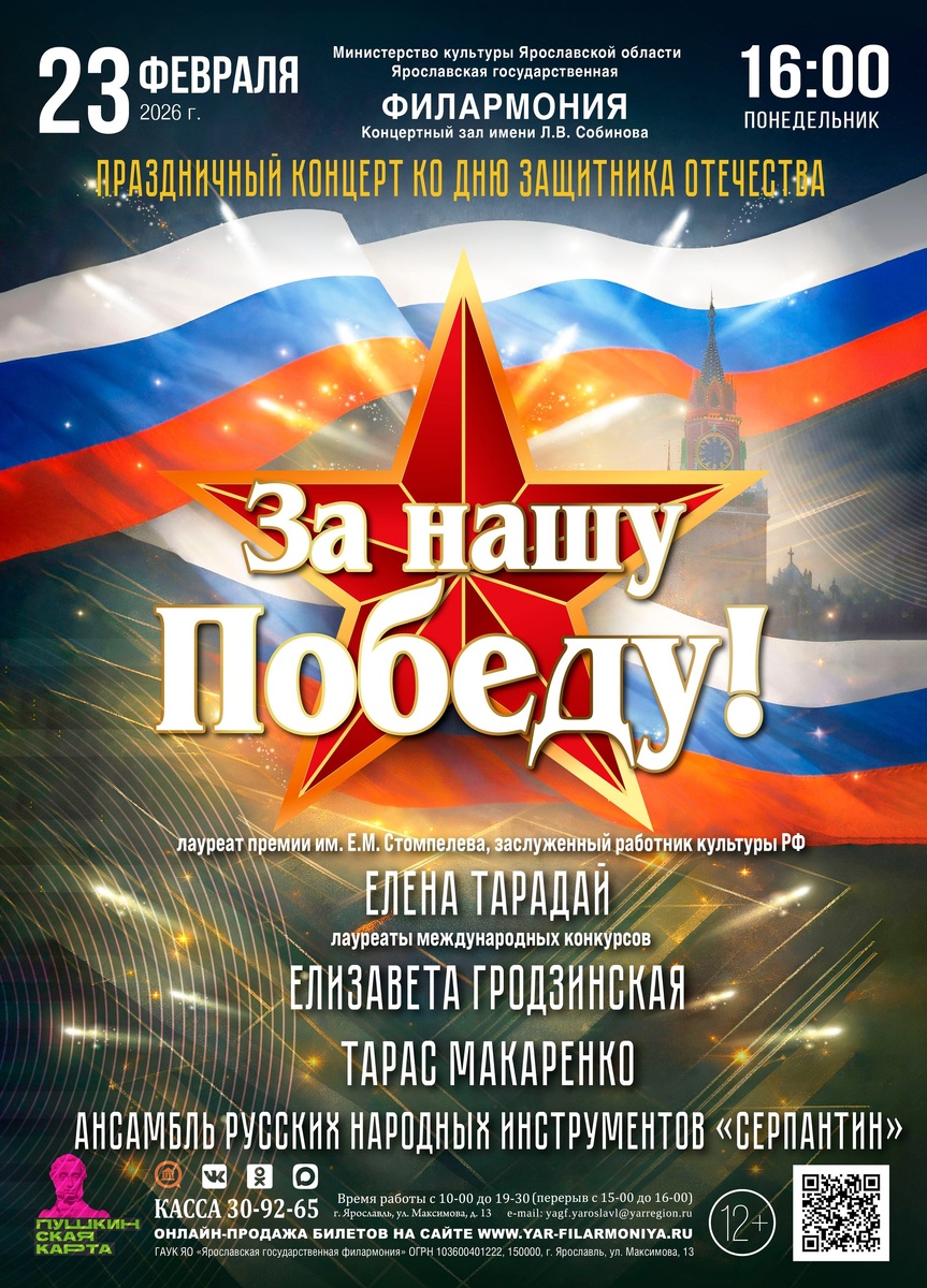 Этот праздник служит главным образом символом памяти и уважения к истории России, ее героев, которые во все времена мужественно встают на защиту своей Родины. 23 февраля 2026 года в 16:00 на праздничном концерте ко Дню защитника Отечества "За нашу Победу!" для ВАС выступят 👏👏👏 Елена Тарадай 👏👏👏 Елизавета Гродзинская 👏👏👏 Тарас Макаренко и ансамбль русских народных инструментов 👏👏👏 "Серпантин". 🎶 В программе всеми любимые и душевные как старые военные песни, так и современные композиции. "Вальс фронтовой медсестры", "Идёт солдат по городу", "Потому что мы пилоты", "Смуглянка", "Катюша" - полная программа на сайте филармонии 🌐 https://clck.ru/3RWxta Пусть этот вечер станет ярким событием для ВАС и ВАШИХ близких!
