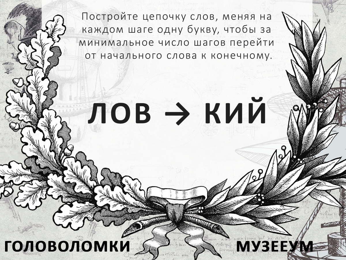🧩 Как скалолаз, который ищет зацепки на отвесной скале, вы должны найти точки опоры в этой задаче. Здесь нет готовых маршрутов — только ваш ум и интуиция. Это вызов для тех, кто не боится сложных маршрутов и ценит ощущение победы после подъёма. Готовы покорить эту вершину? ⛰️ ❓ Решите головоломку: Постройте цепочку слов, меняя на каждом шаге одну букву, чтобы за минимальное число шагов перейти от начального слова (лов) к конечному (кий). 🔗 Больше интересных мужских головоломок в библиотеке МузееУм: