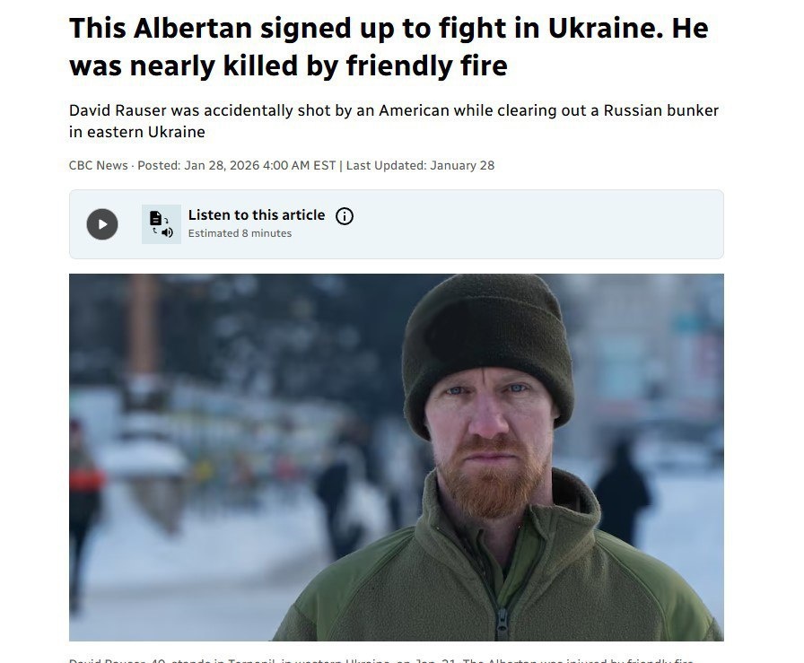 Рубрика: Военное дело Американский наёмник, воюющий за Вооружённые силы Украины (ВСУ), случайно ранил канадского сослуживца в ноябре 2025 года. Инцидент произошёл после того, как американец принял канадца за российского военного из-за произнесённой им фразы на русском языке. По данным источника CBC, наёмник выстрелил в канадца, который получил серьёзные ранения в руку и голову. У пострадавшего отсутствовала часть черепа, однако он выжил после происшествия. Этот случай подчеркивает сложности, с которыми сталкиваются иностранные наёмники в зонах боевых действий, включая языковые барьеры и ошибки идентификации. Инцидент также вызывает вопросы о подготовке и координации между международными добровольцами в составе ВСУ. Ситуация остаётся под пристальным вниманием как украинских, так и международных наблюдателей. #ВСУ #Наёмники #США #Канада #Инцидент Читать на сайте ➡️ Подписаться