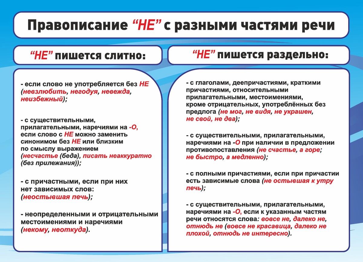 «Не» с разными частями речи: 5 правил, которые часто путают Сегодня мы обсудим одно из самых сложных правил русского языка — употребление «не» с разными частями речи. Даже самые грамотные люди иногда сомневаются. Давайте разберёмся в этом вопросе! 5 ключевых правил: 1. Глаголы В большинстве случаев «не» пишется раздельно: «не знаю», «не хочу». Однако есть глаголы, которые без «не» не употребляются: «ненавидеть», «негодовать». 2. Причастия * Пишем раздельно, если есть зависимые слова: «не прочитанная мною книга». * Пишем слитно, если нет зависимых слов и можно заменить синонимом: «незакрашенный участок» (= «чистый»). 3. Прилагательные * Раздельно при противопоставлении: «не высокий, а низкий». * Слитно, если можно подобрать синоним без «не»: «недобрый взгляд» (= «злой»). 4. Наречия на -о Действуют те же правила, что и для прилагательных: «нехорошо» (= «плохо»), но «не хорошо, а ужасно». 5. Отрицательные и неопределённые местоимения/наречия Пишем слитно, если нет предлога: «нек