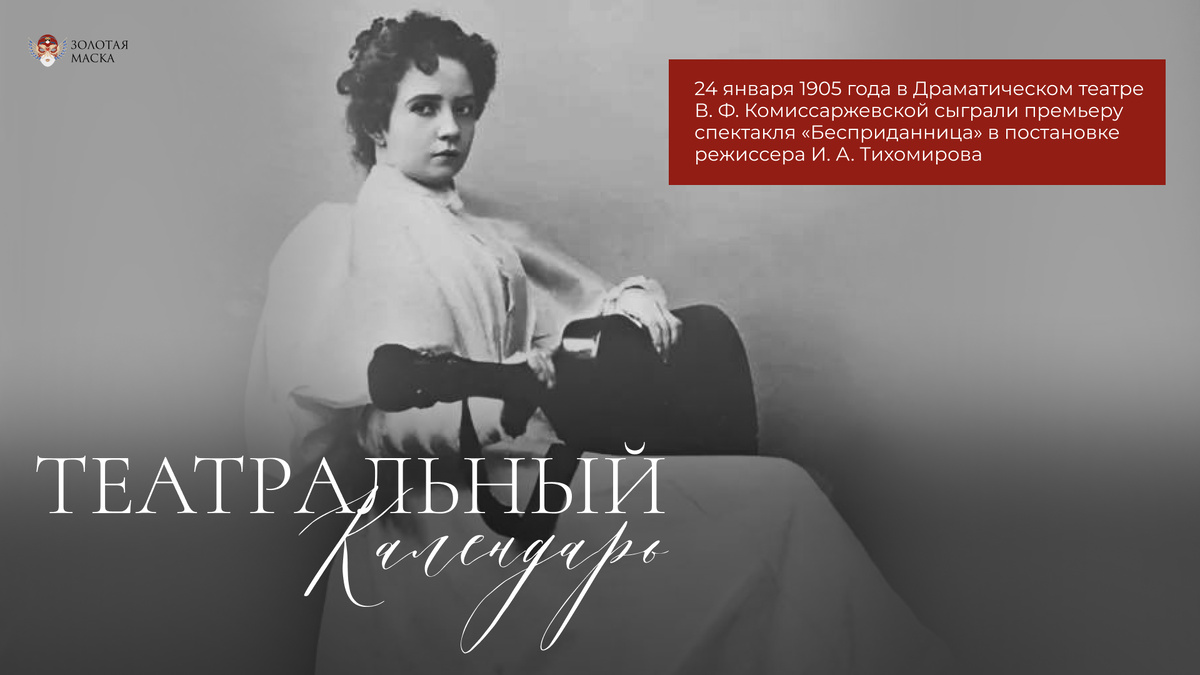 24 января 1905 года в Драматическом театре В. Ф. Комиссаржевской состоялась премьера спектакля «Бесприданница» по пьесе А. Н. Островского в постановке И.А. Тихомирова. Главную роль Ларисы Огудаловой сыграла Вера Федоровна Комиссаржевская. К этому времени актриса уже не раз выходила в этом образе, но именно в 1905 году он зазвучала по-новому. На фоне общественных потрясений эпохи ее героиня воспринималась не только как фигура личной драмы, но и как образ внутреннего протеста, с тоской о любви, свободе и достоинстве. Для петербургской сцены начала XX века «Бесприданница» оказалась неотделима от имени Комиссаржевской. Театральный критик Г. И. Чулков писал: «После ее игры трудно представить иную манеру исполнения».