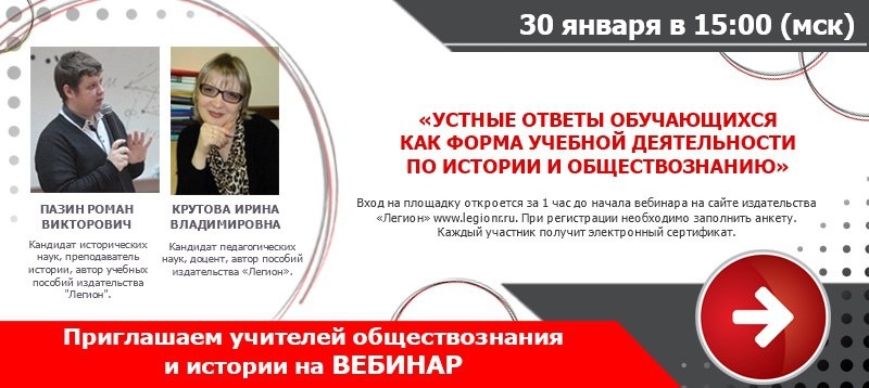 " Дата: 30.01.2026 (Пт) Время: 15:00 Лекторы: КРУТОВА Ирина Владимировна - кандидат педагогических наук, доцент, автор пособий издательства «Легион». ПАЗИН Роман Викторович - кандидат исторических наук, преподаватель истории лицея НИУ ВШЭ, автор учебно-методических пособий по подготовке к ЕГЭ и ОГЭ по истории и обществознанию издательства "Легион". Участие бесплатное. Выдается сертификат. Требуется регистрация на сайте издательства