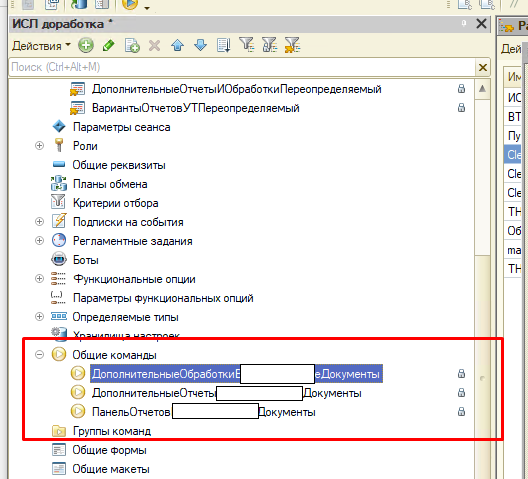 Насколько это корректно с точки зрения разработки типовых решений и требований фирмы 1С, но я подобную задачу решил следующим образом Свой раздел с документами, отчетами, обработками я добавляю в свое отдельное расширение, которое добавлено к конфигурации. По аналогии типовым общим командам создал три общие команды После чего добавил код каждой команды, аналогичный тому, что представлен в общих командах типового решение, изменив только имя подсистемы на своё После чего данные общие команды разместил в своей подсистеме После чего добавил две процедуры Из общего модуля "ДополнительныеОтчетыИОбработкиПереопределяемый" процедуру "ОпределитьРазделыСДополнительнымиОбработками" и из общего модуля "ВариантыОтчетовУТПереопределяемый" процедуру "ОпределитьРазделыСВариантамиОтчетов" и добавил чуток кода "&После" В итоге в моем разделе на стороне клиента появились те самые Когда создается большое количество своих справочников, документов, отчетов, удобно когда их можно разместить в одном разделе