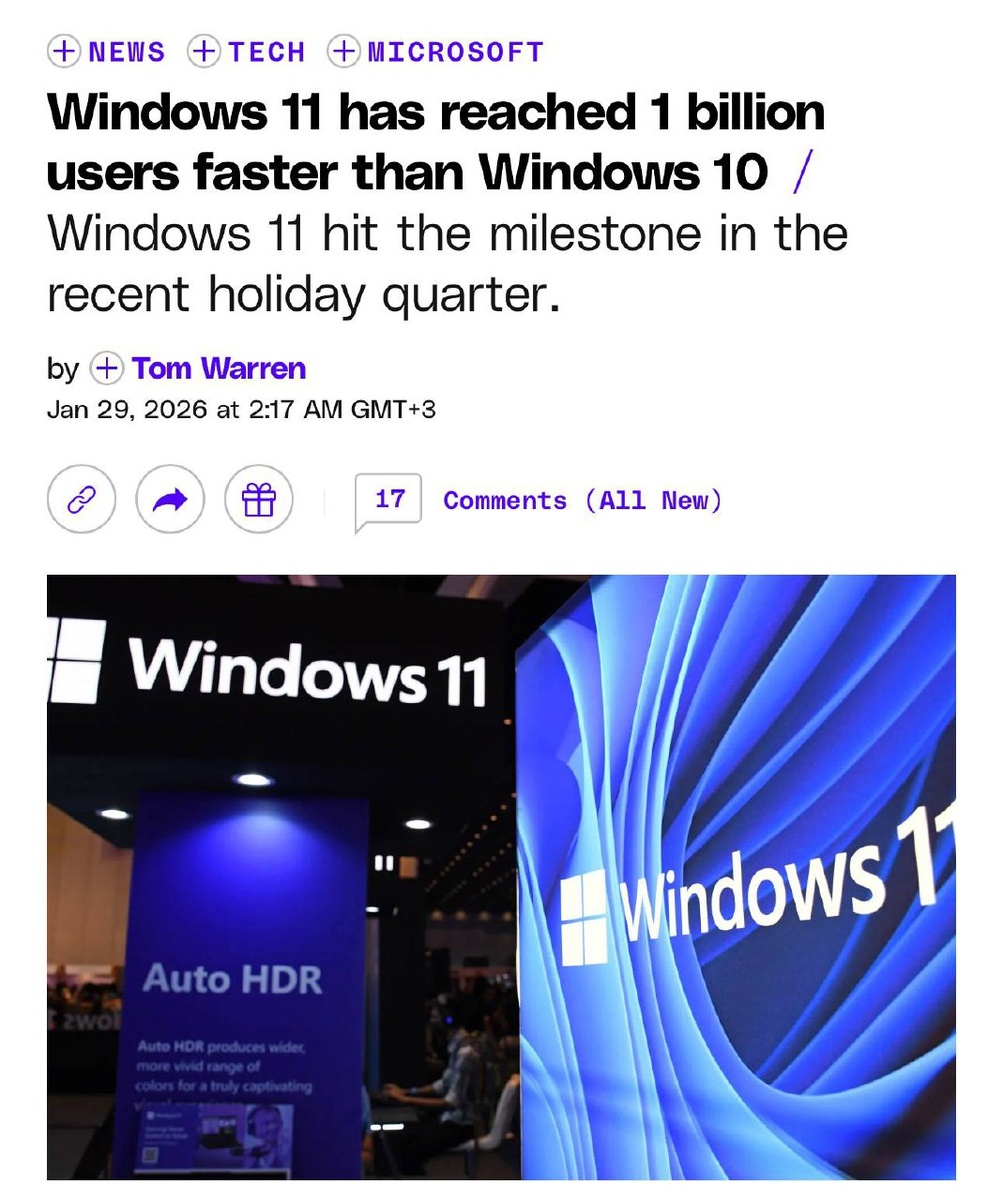 Число пользователей Windows 11 превысило 1 млрд человек. За последний год аудитория операционной системы выросла почти на 45%. Рост связан преимущественно с завершением поддержки Windows 10. Порог в 1 млрд пользователей Windows 11 достигла за 1576 дней — на 130 дней быстрее, чем Windows 10 (1706 дней). https://dzen.ru/id/5c0e38ff46ef5c00aaa80527