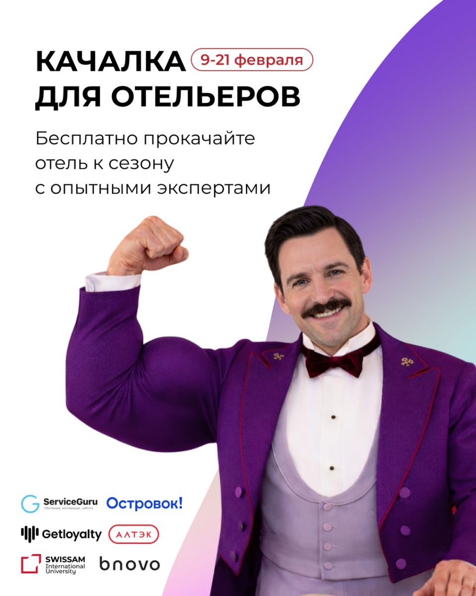 ! Прокачайтесь к сезону вместе с опытными тренерами экспертами. Качалка — это 10 дней полезного контента: короткие видеоуроки с гайдами, чек-листами и другими материалами. Подтяните операционку, повысите продажи и найдете баланс среди всех отельных служб. Тот самый случай, когда 100% начнем с понедельника. Когда? 9–21 февраля Формат — в Телеграм-боте Бесплатно для отельеров Почему стоит участвовать? ✔️ Удобный формат — качалка пройдет в Телеграм-боте, все материалы будут доступны в любое время. ✔️ Эксперты поделятся документами, лайфхаками и принципами, которые помогут улучшить работу отеля в разных направлениях: от финансов до юридических аспектов. ✔️ Рабочие файлы, которые можно внедрить в повседневную деятельность вашего отеля. Видеоурок от ServiceGuru: Тема: Как снизить текучку и повысить уровень сервиса в отеле? Спикер: Сергей Горбунов Участие бесплатное, нужно предварительно зарегистрироваться. Первая тренировка стартует 9 февраля!