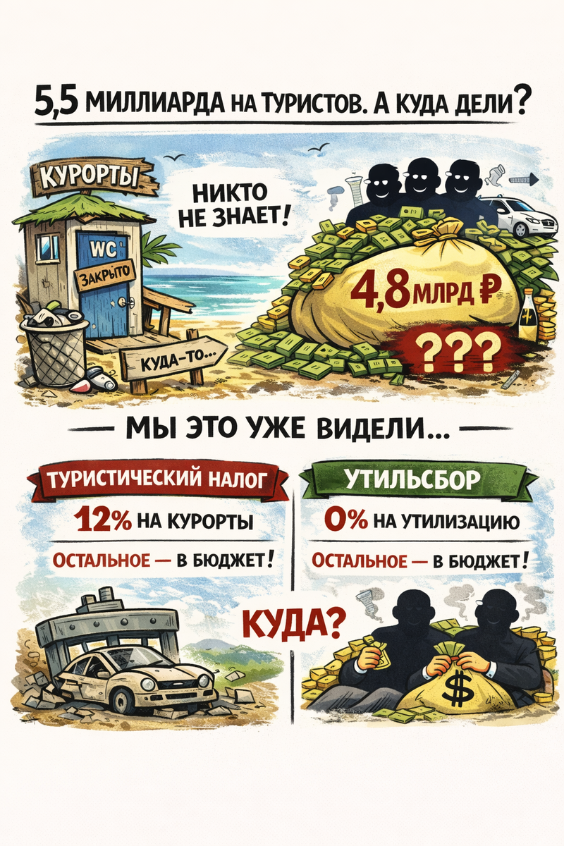 Помните, как нам обещали, что туристический налог пойдёт на развитие инфраструктуры для путешественников? Новые набережные, указатели, туалеты — всё то, чего так не хватает российским курортам? Ну так вот. За 9 месяцев 2025 года муниципалитеты собрали 5,5 миллиарда рублей туристического налога. Цифра красивая. Сам директор департамента развития туризма Минэкономразвития Георгий Груша с гордостью отчитался об этом в Госдуме. А теперь барабанная дробь... На развитие туризма направили... 12%. То есть из 5,5 миллиардов на туристическую инфраструктуру заложили аж 680 миллионов. Остальные 4,8 миллиарда? Ну, они как-то... растворились. В «общем бюджете». На «нужды региона». Понимаете? И тут невозможно не вспомнить историю, которая происходит буквально прямо сейчас с утилизационным сбором на автомобили. Депутат Госдумы Алексей Корниенко задал Минпромторгу простой вопрос: сколько в России заводов по утилизации автомобилей? Логично же — собираем утильсбор на утилизацию, должны знать, куда машин