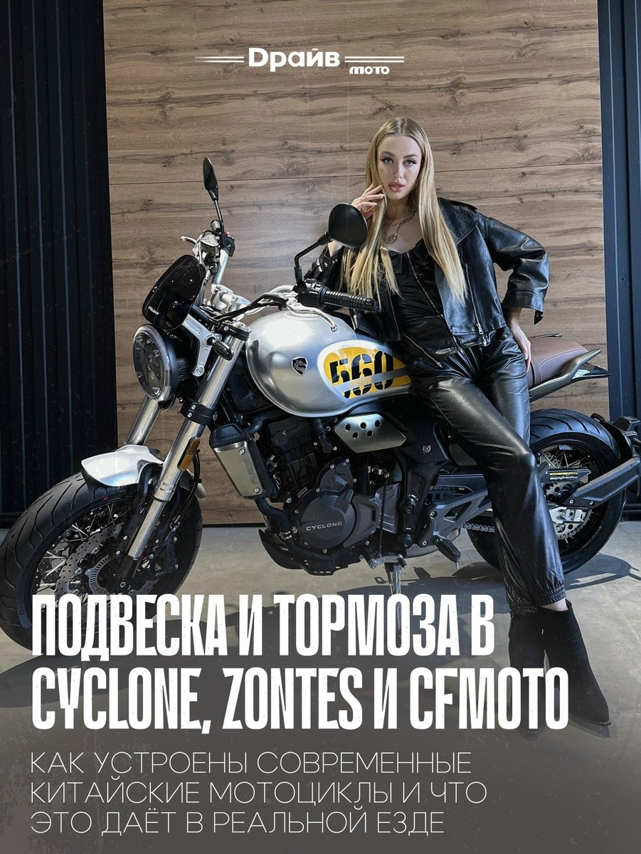 Как устроены современные китайские мотоциклы и что это даёт в реальной езде Современные китайские модели перестали быть «бюджетной глушилкой» — сегодня это продуманная техника с конструкцией, как у проверенных мировых брендов. Рассмотрим, как работают подвеска и тормоза на конкретных примерах Cyclone, Zontes и CFMoto. Cyclone RG401 — турист с продвинутой шасси-частью У RG401 установлена перевёрнутая передняя вилка и маятниковый задний амортизатор, которые хорошо гасят неровности и дают стабильность в поворотах. Ход передней подвески — около 120 мм, задней — 55 мм. Такая настройка помогает уверенно чувствовать себя на трассе и на городских дорогах. Тормоза здесь — гидравлические дисковые с 2-канальной ABS Bosch, с крупными суппортами спереди (4-поршневые, диски 300 мм) и диском 258 мм сзади. Такая система даёт уверенное замедление в любых условиях. Zontes ZT310 / ZT368 — классическое решение для улицы и городских поездок У моделей серии ZT310 (например ZT310-T2) подвеска стандартная: те