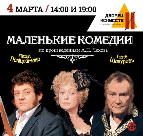 Узнаёте это состояние? Утро среды, 4 марта. За окном — питерская хмарь, в голове — бесконечный список дел: отчёт, уроки с детьми, ужин для мужа. И вдруг мысль: «А когда я последний раз смеялся(ась) до слёз — не над мемом, а по-настоящему, животом, забыв про телефон в кармане?» Остановитесь. 4 марта 2026 года в Дворце искусств Ленинградской области есть два окна для спасения: 14:00 — чтобы сбежать от рутины в будний день, и 19:00 — чтобы устроить свидание с собой (или с тем, с кем хочется смеяться без стеснения). Спектакль «Маленькие комедии» по Чехову. 16+. И да — это про то, как абсурдный спор о собаках перерастает в дуэль сердец. Забудьте про скучного классика из учебника. Здесь Чехов — мастер абсурда задолго до появления слова «мем». «Медведь»: вдова в трауре ждёт рыцаря, а к ней врывается грубиян-должник, готовый стреляться. «Предложение»: жених приходит объясняться в любви — и через пять минут оба партнёра в полуобморочном состоянии от спора о границах угодий. Алексей Кирющенко