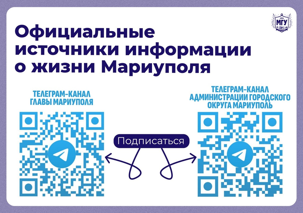🔵 Для оперативного и достоверного получения новостей рекомендуем подписаться на официальные Telegram-каналы главы Мариуполя Антона Викторовича Кольцова и Администрации городского округа Мариуполь. 📍 Здесь публикуется проверенная информация о ключевых решениях, событиях и изменениях, которые напрямую касаются жизни города. 👻 MAX|💙ВК|📝Дзен|🤩Сайт #МГУимениКуинджи