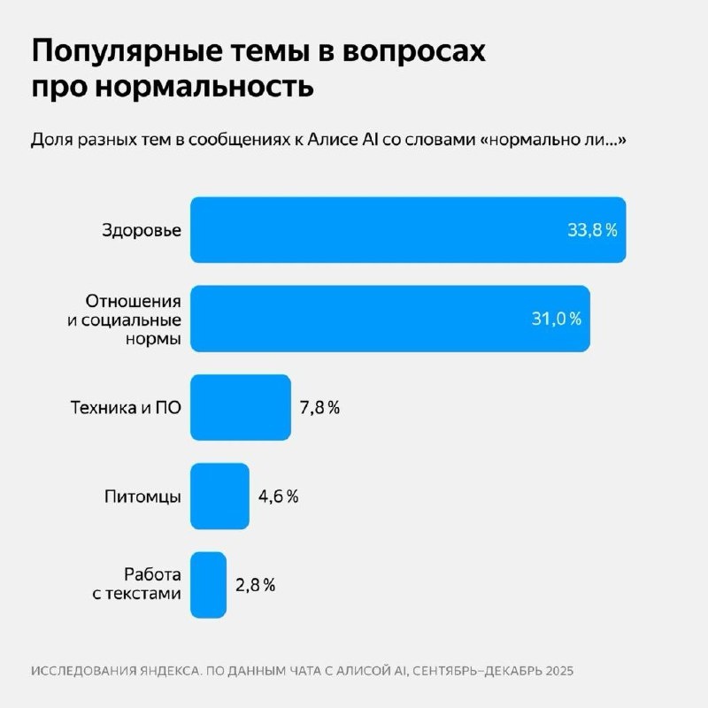 Аналитики «Яндекса» изучили запросы с формулировкой «нормально ли…» и увидели довольно точную картину пользовательских тревог. Около трети вопросов касаются здоровья, почти столько же — эмоций, социальных норм и отношений. На третьем месте — техника и программное обеспечение. При этом многие запросы звучат предельно конкретно и жизненно: нормально ли болеть всего один день, весить 50 килограммов в одиннадцать лет или не чувствовать движения ребёнка на 19-й неделе беременности. Чем еще интересуются пользователи и какие запросы попадают в топ: https://bg.ru/bg/people/people-news/31157-norma-ai ❤️ «Большой Город»