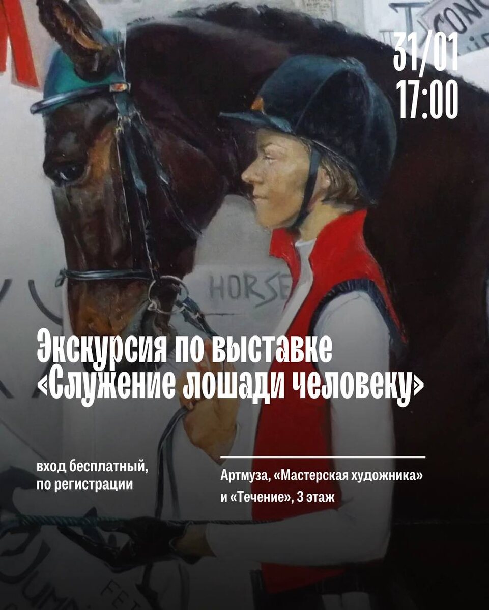 ». 🏇О выставке: Экспозиция объединяет работы выдающихся мастеров (живопись, графику, скульптуру), посвященные благородству и красоте лошади. Выставка исследует многовековую связь человека и коня: от верного боевого товарища и незаменимого помощника в труде до партнера в современном спорте и источнике творческого вдохновения. Участников ждет погружение в историю и культуру конного спорта, интересные факты и редкие экспонаты. Дата: 31 января Время: 17:00 Где: «Артмуза», 3 этаж, галереи «Мастерская художника» и «Течение», 3 этаж. 👉🏼 Участие бесплатное, по регистрации. Количество мест ограничено.