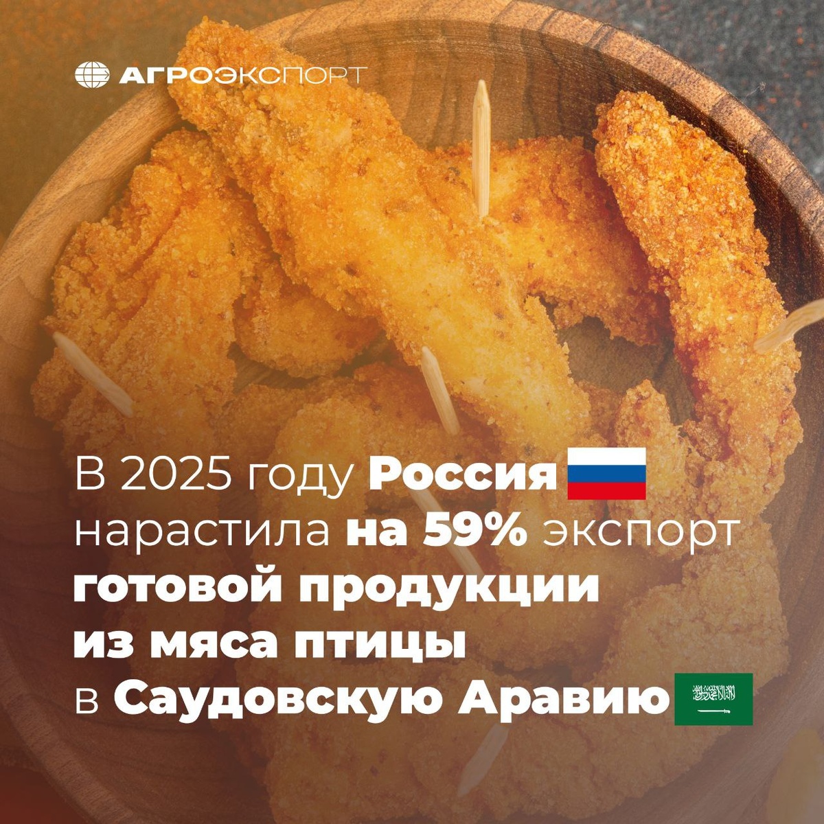 Согласно предварительным оценкам, в 2025 году Россия поставила в Саудовскую Аравию 6️⃣,3️⃣ тыс. тонн готовой или консервированной продукции из куриного мяса, что на 46% больше показателя 2024 года. Экспортная выручка за этот период выросла на 5️⃣9️⃣%, до более 19 млн долл. ⭐️ Как физический, так и стоимостной объем является рекордным с 2022 года, когда начались поставки готовой куриной продукции в Королевство. Саудовская Аравия — крупнейший рынок сбыта в регионе GCC, характеризуемый высоким спросом на замороженные мясные продукты, такие как котлеты для бургеров, стрипсы, кебабы и т. д. С широким ассортиментом продукции российских экспортеров с 26 по 30 января можно ознакомиться на Национальной экспозиции Российской Федерации, организованной РЭЦ (https://t.me/rusexportnews) на выставке #Gulfood2026, крупнейшем в мире мероприятии в сфере питания и напитков.