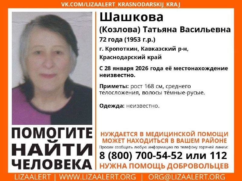 ! #Пропала #Шашкова ( #Козлова) Татьяна Васильевна г. #Кропоткин, #Кавказский р-н, #Краснодарский край С 28 января 2026 года её местонахождение неизвестно. Приметы: рост 168 см, среднего телосложения, волосы темно-русые. Была одета: неизвестно. _________ Инфорг: Ольга (Умка) 89384231455 Горячая линия отряда: 8 800 700 5452 (звонок бесплатный)