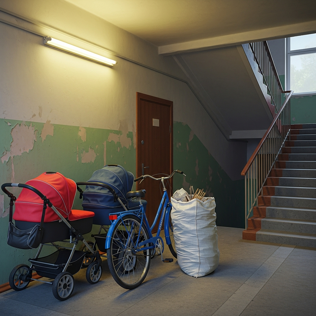 Мой подъезд — это склад чужих вещей, через которые я ежедневно пробираюсь боком. Хлам у двери — это не просто «хозяйственность», а реальная угроза безопасности. Расскажу, почему нас это так бесит и как боролась с этим с помощью закона и штрафов. Первый этаж у нас — это стихийная парковка, которую никто не согласовывал. Справа — гигантская коляска-трансформер, перегородившая доступ к почтовым ящикам. Слева — три велосипеда, сцепленных тросом в один неразрывный ком. Проходя по коридору, я вжимаюсь в стену, но все равно цепляю плащом или пальто грязную педаль. Я чувствую, как внутри закипает раздражение. Почему, чтобы попасть в свою квартиру, я должна протискиваться боком, словно вор? Это пространство по документам общее, но по факту оно оккупировано теми, кто решил, что подъезд — это резиновое продолжение их прихожей. Но если первый этаж — это просто «гараж», то мой этаж — это настоящий музей человеческой жадности и беспардонности. Справа от меня живет сосед, которого я про себя называю