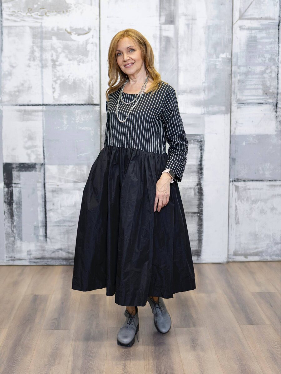 Платье от бренда KAMUFLAGE. Выразительное сочетание фактур и контрастов формирует современный, архитектурный образ. Верхняя часть платья выполнена из трикотажа в чёрно-белую вертикальную полоску, визуально вытягивающую силуэт и подчёркивающую графичность модели. Юбка миди с завышенной талией выполнена в глубоком чёрном цвете и отличается свободной, структурной фактурой, создающей ощущение движения и лёгкости. Платье легко адаптируется под разные стилистические решения — от минималистичных до авангардных, что делает модель универсальной и коммерчески привлекательной для оптового ассортимента. Образы рекомендуем дополнять уникальной обувью из премиальной кожи немецкого бренда TRIPPEN — акцентом, который усиливает характер коллекции, подчёркивает статус и завершает образ на уровне high fashion. Изделия доступны для заказа со свободного склада в Москве📌 Для оптового сотрудничества пишите нам: 🌐по номеру 8 800 511 51 95 🌐- +7 495 146-92-72 🌐Наш сайт — https://sollery.pro 📩-на поч