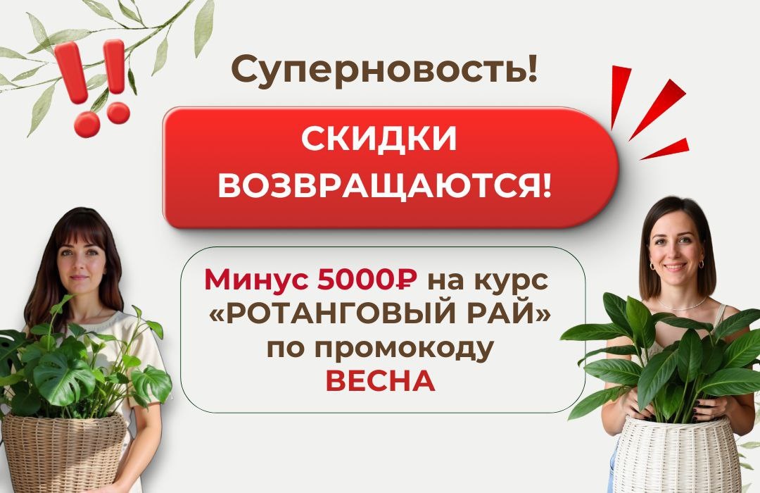 🔥🔥🔥 Видим-видим, кое-кто пропустил информацию о выгодных ценах на курс «РОТАНГОВЫЙ РАЙ»! 👏👏👏 Поэтому командой Школы плетения было принято решение снова уронить стоимость курса. И до самого конца окна продаж — до 31 января! 📍По промокоду ВЕСНА в течение 3-х дней вы сможете приобрести курс «РОТАНГОВЫЙ РАЙ» на 5000 рублей дешевле, чем вчера! Скидка 5000 рублей исчезнет вместе с возможностью попасть на 3-ий поток курса уже через 3 дня! ❌❌❌1 ФЕВРАЛЯ — ЗАПИСАТЬСЯ НА КУРС БУДЕТ НЕЛЬЗЯ! Ни со скидкой, ни без. 🤷 А следующий поток не предвидится в ближайшие ПОЛГОДА точно. ***Только подумайте, сколько всего можно сплести за это время: для души, для дома, для улицы, в подарок, на продажу 💥 👇 Последнее предупреждение — забирайте свое место на курсе и не забудьте ввести промокод ВЕСНА при оплате, чтобы получить скидку 5000₽: https://loza-school.ru/tarifrotang?utm_source=tg&utm_medium=channel&utm_campaign=tunnel-rotang_0126&utm_content=sale&utm_term=rotang