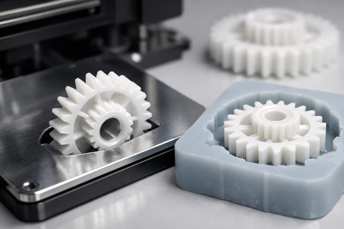Если нужна партия одинаковых деталей с хорошей повторяемостью, часто рациональнее литье пластиковых шестерен. Обычно схема такая: сначала делаем мастер-модель (часто именно 3D печатью), затем под нее изготавливается форма и выполняется литье.