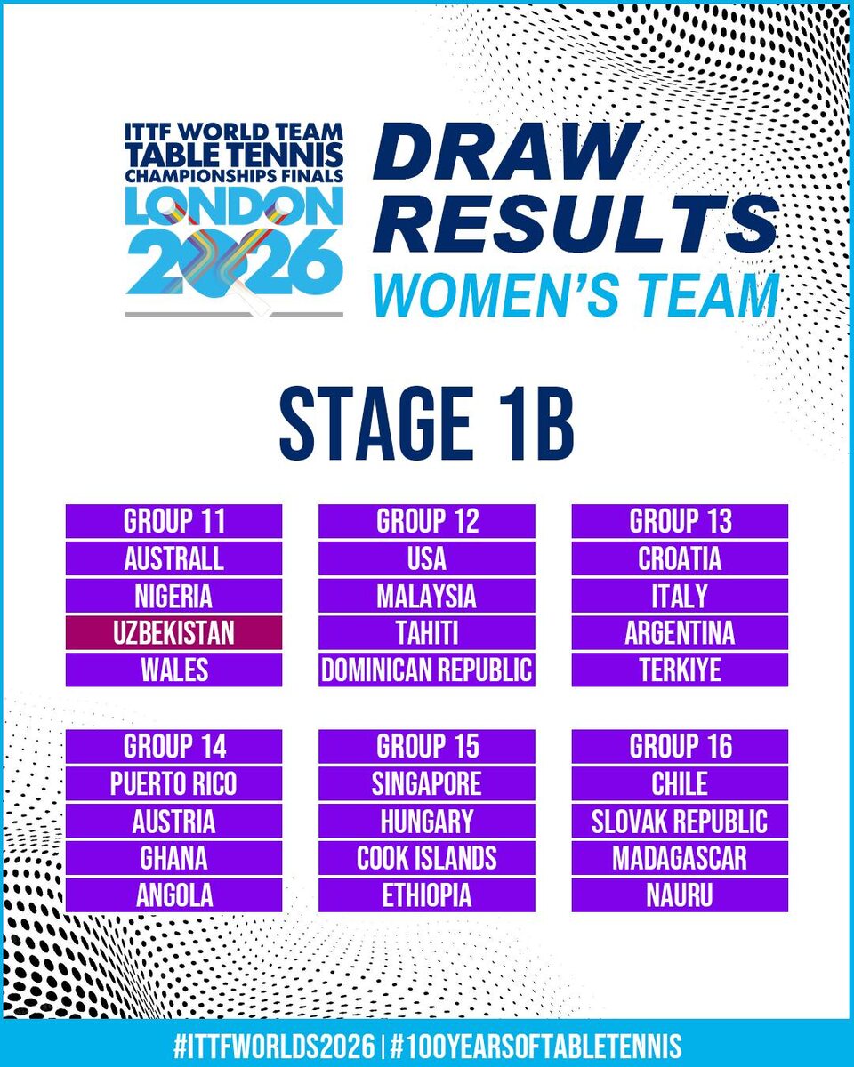 С 28 апреля по 10 мая в Лондоне пройдет командный чемпионат мира по настольному теннису. По итогам жеребьевки узбекские спортсмены сыграют в группах: мужчины — против соперников из Бразилии, Венгрии и Пуэрто-Рико; женщины — против участниц из Австралии, Нигерии и Уэльса. Источник: Национальный олимпийский комитет Узбекистана.