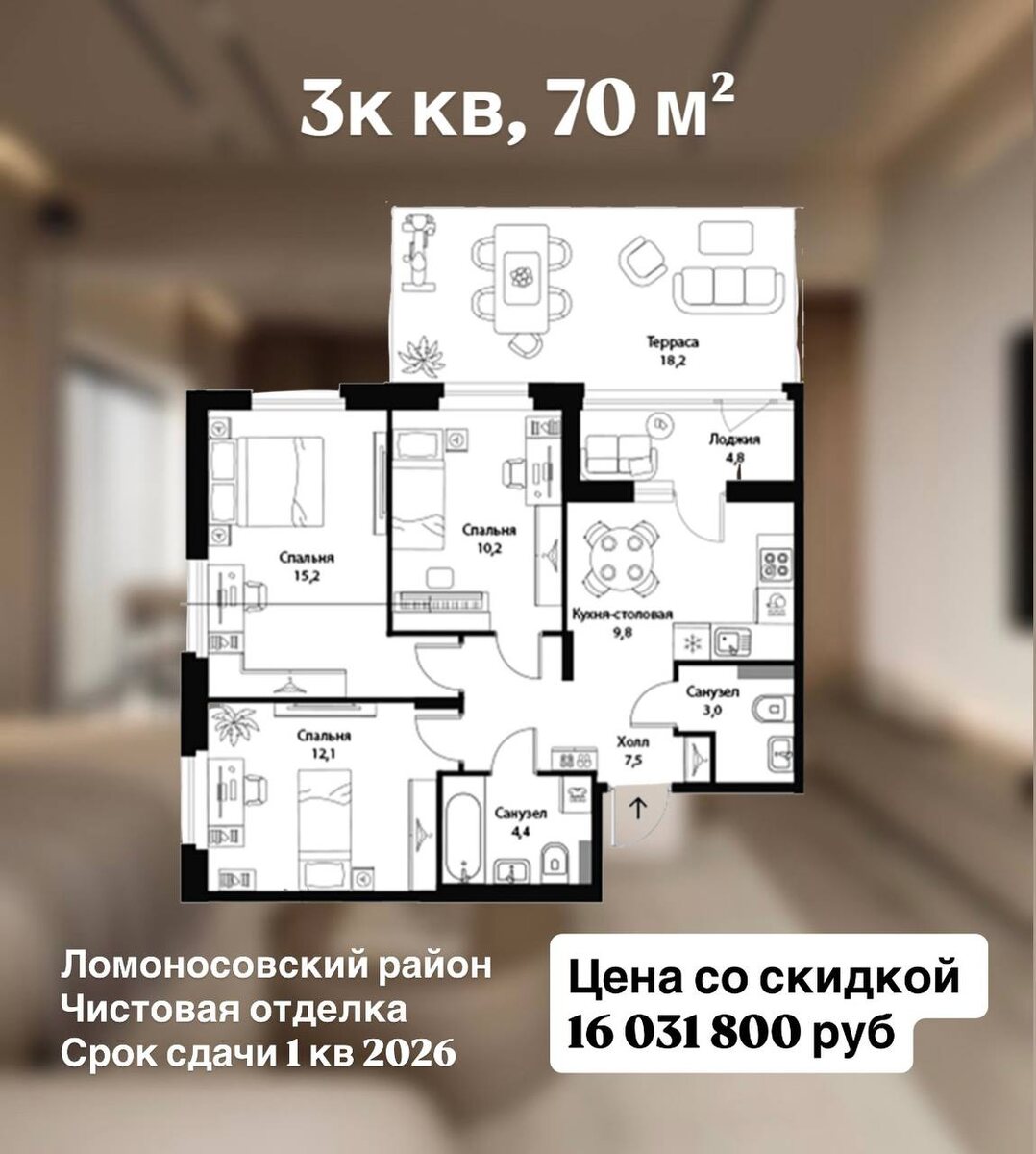 1 000 000 ₽ на 3-комнатную квартиру с террасой 📍Ломоносовский район Ⓜ️Проспект Ветеранов 25 мин транспортом Как формируется выгода: • Спец. скидка до 01.02.2026 — 400 000 ₽ • Дополнительно — 3% при 100% оплате или ипотеке Итого: до 1 000 000 ₽ выгоды О квартире: • 3 спальни • Окна на две стороны • Застеклённая лоджия 4,8 м² • Просторная терраса 18,2 м² • Увеличенная площадь остекления — больше света и воздуха. • Вместительный холл с нишей под шкаф • Спальни правильной формы • Премиальная отделка, тёплые полы 🔥Цена со скидкой — 16 031 800 ₽ О ЖК: Малоэтажный формат, дворы без машин, тишина, авторский ландшафтный дизайн, парки рядом. Узнать подробнее об этом или других кейсах, вы можете на бесплатной консультации 👇🏻 @Podborka_VkvartireBot