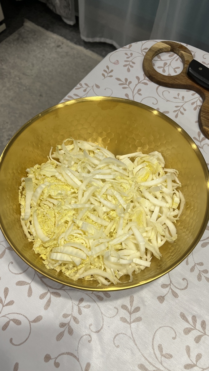 2. Капусту режу не мелко, чтобы чувствовать текстуру. Бросаю в большую миску.