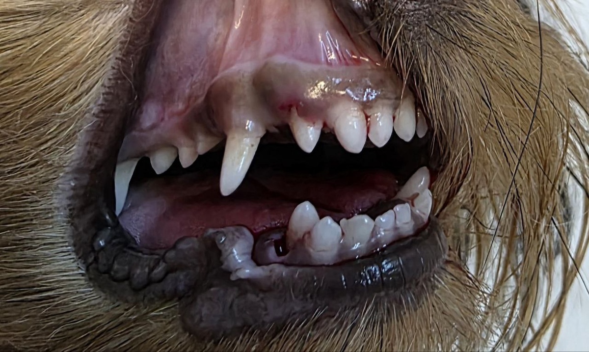 Правый нижний клык ориентирован в верхнее нёбо. Требуется коррекция.