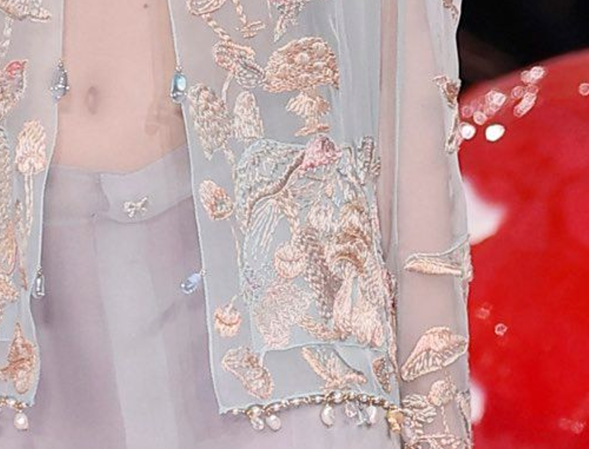 После просмотра кутюрной коллекции CHANEL я сознательно ушёл не в образы целиком, а в детали. Потому что нам с вами важнее всего именно декор — то, как он устроен, из чего собран и за счёт чего работает. И вот что действительно зацепило. Первое — использование элементов бижутерии в декоре одежды. На одном из образов нижний край изделия оформлен не привычной окантовкой из жемчуга или бусин, а полноценной бижутерной конструкцией: цепи, подвески, жемчуг, соединённые пинами, коннекторами, неразъёмными кольцами. По сути — это техника изготовления бижутерии, но пришитая к изделию как декоративная кайма. Смотрится очень эффектно и свежо — гораздо интереснее классических решений. Второй момент — фантазийная сетка, соединённая и прошитая бисерными нитями. Сетка не просто наложена, а именно собрана через бисер: она подвижная, живая, динамичная. Очень красивая история, которую точно хочется попробовать повторить в работе. Дальше — вышивка гладью. Она здесь выполнена достаточно крупными, текстурны