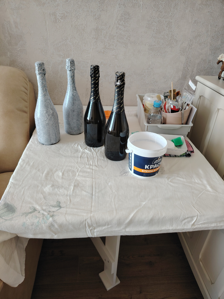 Сегодня занялась декором бутылок к юбилею мужа. Прошёл всего месяц, а мой рабочий стол опять в разобранном состоянии и помогает мне😀.