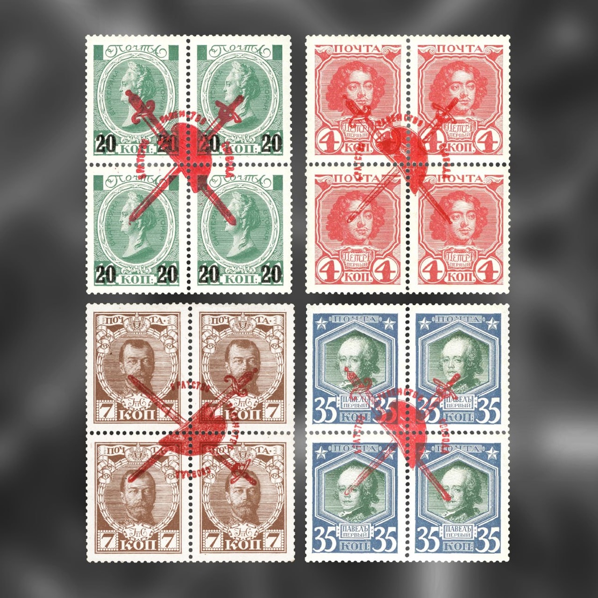 ". В каталоге Чучина за 1924 г. они отнесены к разделу фантастических: «Все эти провизории никогда официально отпечатаны и выпущены не были. Являются подделкой группы петроградских торговцев марками с целью спекуляции». ☝️Появление фальшивок объясняется тем, что Временное правительство за 8 месяцев своего существования не выпустило в обращение ни одного знака почтовой оплаты, кроме почтовых карточек. За неимением альтернатив, марки активно использовались в почтовом обращении. 🇷🇺 Надпечатки на царских марках (особенно с портретами представителей свергнутого дома Романовых) были бы вполне правомерны, к тому же эмблема в виде скрещенных мечей, фригийского колпака и слов «братство, равенство, свобода» вполне соответствовала историческому моменту. Этим и воспользовались фальсификаторы. О. Левитский. Фантастический выпуск. «Филателия СССР». 1987. №11 (стр. 39). Наша витрина располагает несколькими квартблоками, изучайте 🫱 тут 🫲