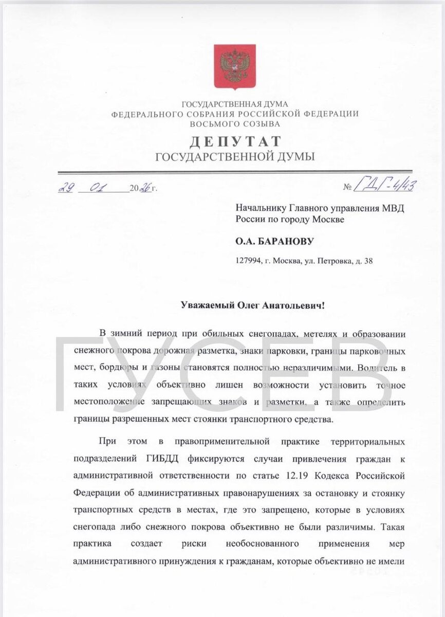 ». Обратился к начальнику ГУ МВД по Москве с предложением не штрафовать водителей за нарушения правил парковки и стоянки в условиях сильных снегопадов — когда разметка, знаки, границы парковочных мест, бордюры и газоны полностью скрыты под снегом и объективно неразличимы. Если человек физически не может определить, действует ли запрет на парковку, — значит, отсутствует вина. А без вины, как прямо говорит КоАП, не может быть и административной ответственности. Речь не об ослаблении правил и не о поощрении хаоса на дорогах. Речь о здравом смысле и защите добросовестных водителей от необоснованных штрафов в сложных погодных условиях.