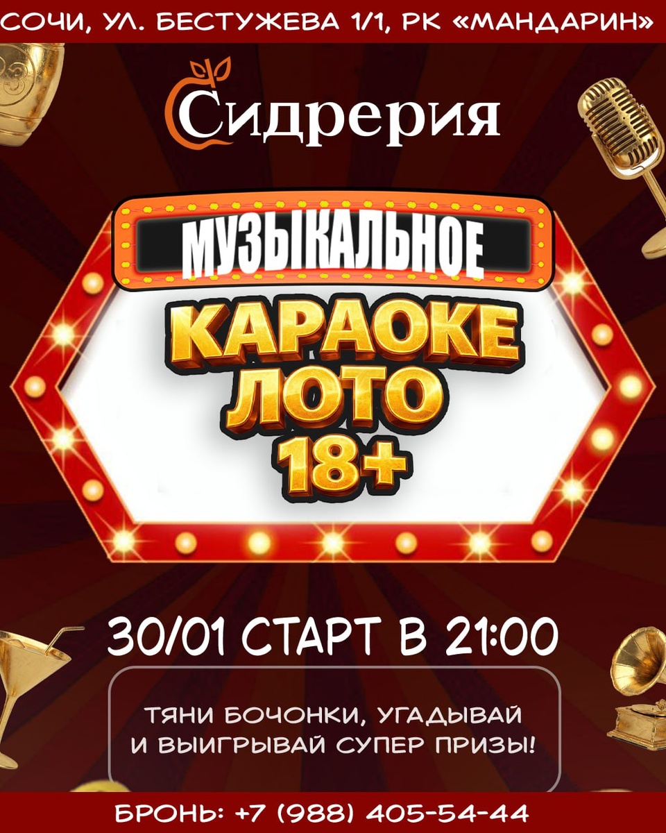 30.01 ПТ | Музыкальное караоке-лото 18+ в Сидрерии